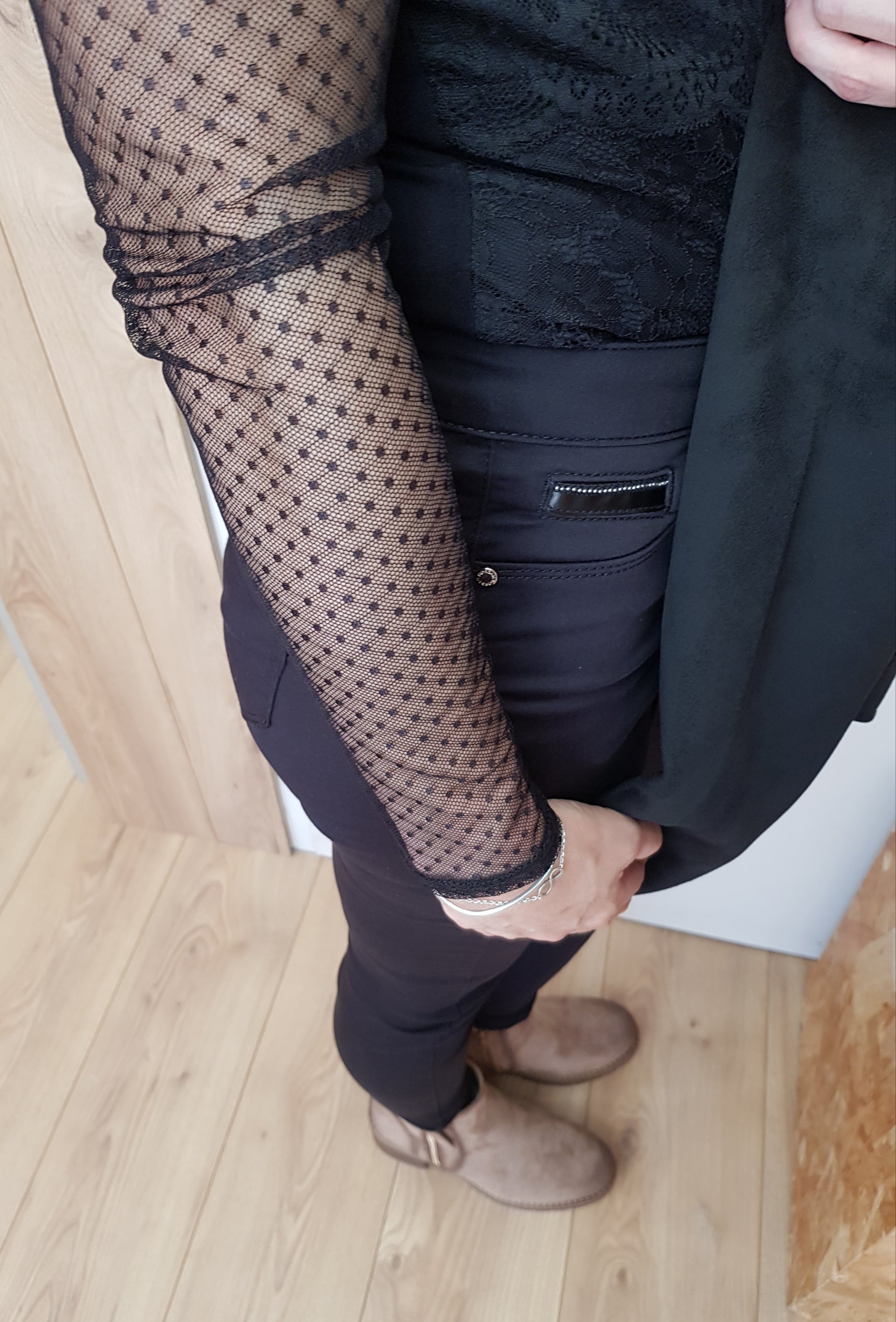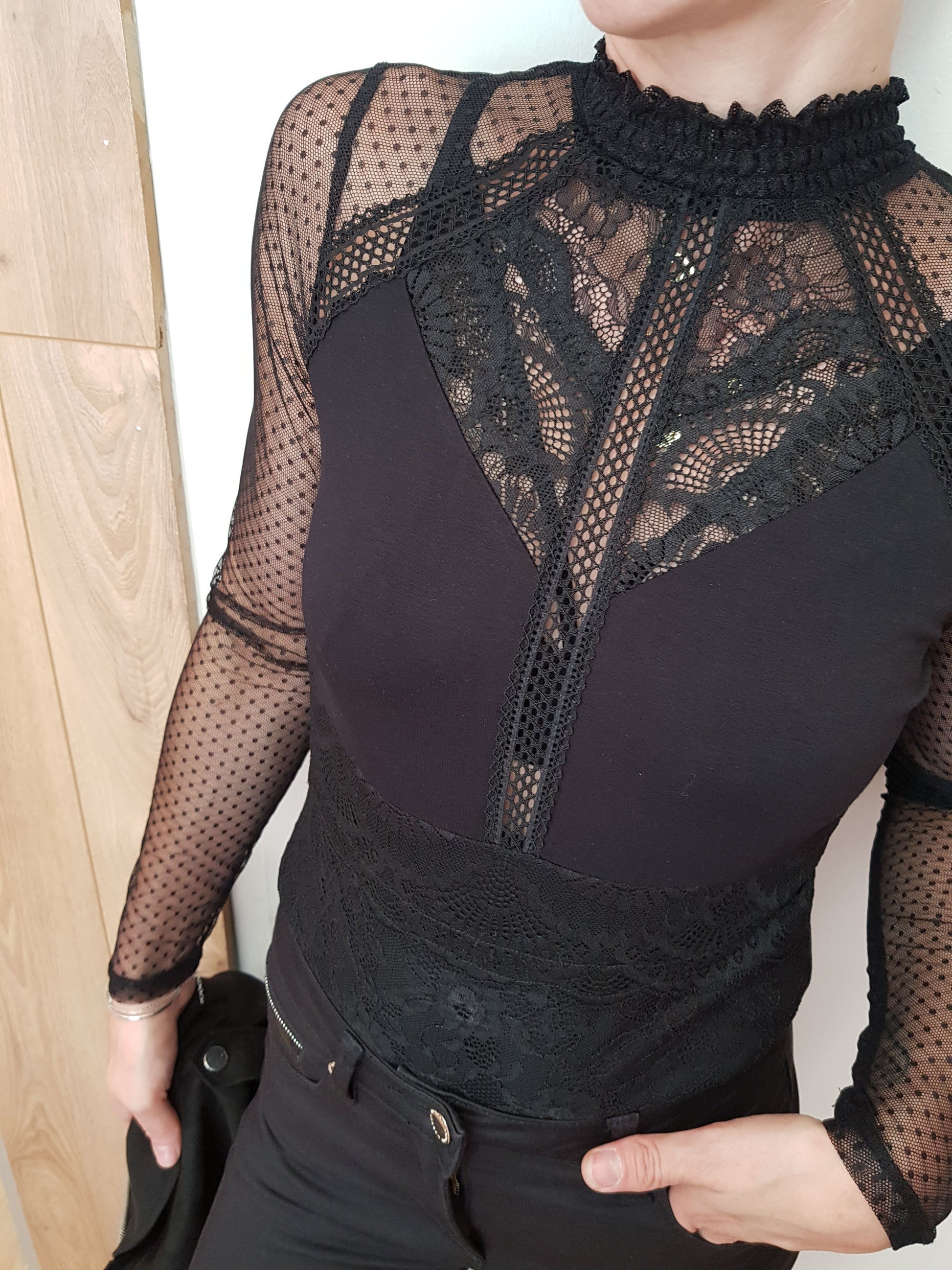 Un vrai coup de cœur pour ce body noir à col montant. Sa coupe ajustée souligne la silhouette avec élégance, tandis que la dentelle florale et les manches en tulle à pois apportent une touche raffinée et audacieuse. À porter seul ou sous une veste, il s’adapte aux envies du jour comme aux looks du soir.