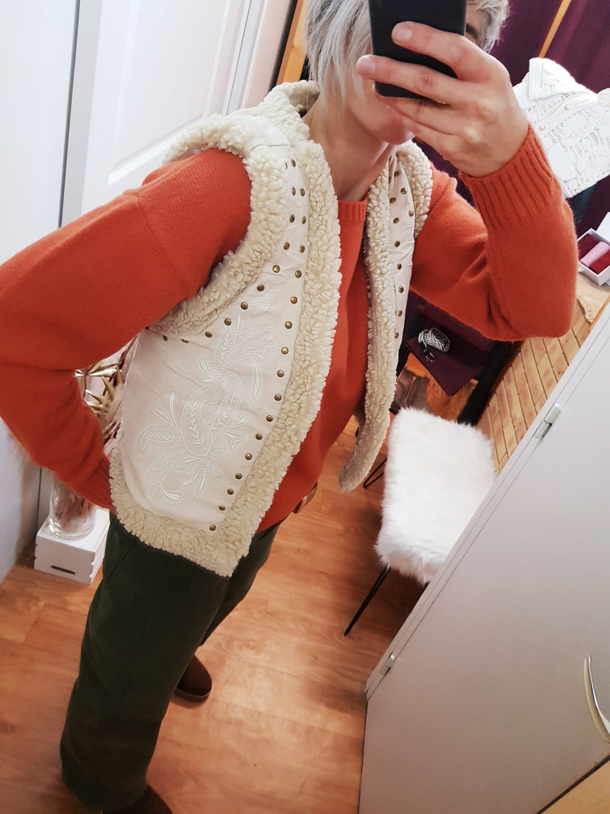 Un gilet qui joue sur les contrastes de matières et les détails. Ce modèle sans manches en maille effet shearling (une texture douce et bouclée qui imite la peau lainée,) rehaussé de clous métalliques discrets, pour une allure à la fois cosy et affirmée. Il se porte ouvert et structure la silhouette avec élégance.
