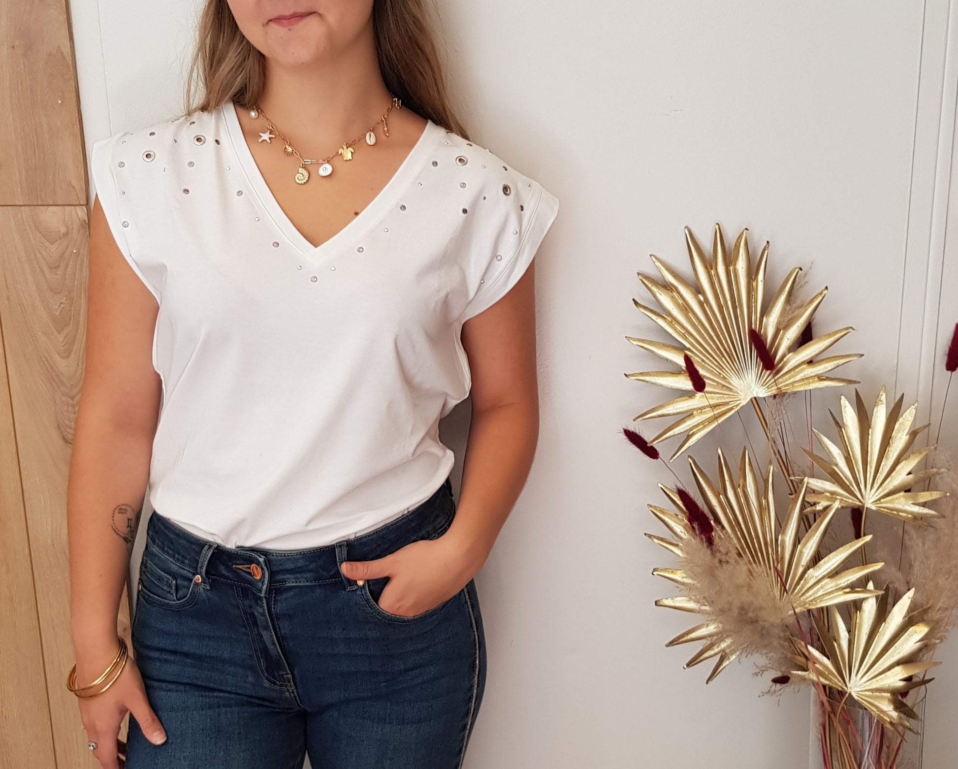 Un essentiel revisité avec caractère et subtilité. Ce T-shirt blanc à encolure V se distingue par ses œillets métalliques, qui apportent une touche moderne et lumineuse. Sa coupe droite offre une tenue structurée, idéale pour un look affirmé. Les détails sur l’encolure et l’épaule ajoutent du relief sans en faire trop.