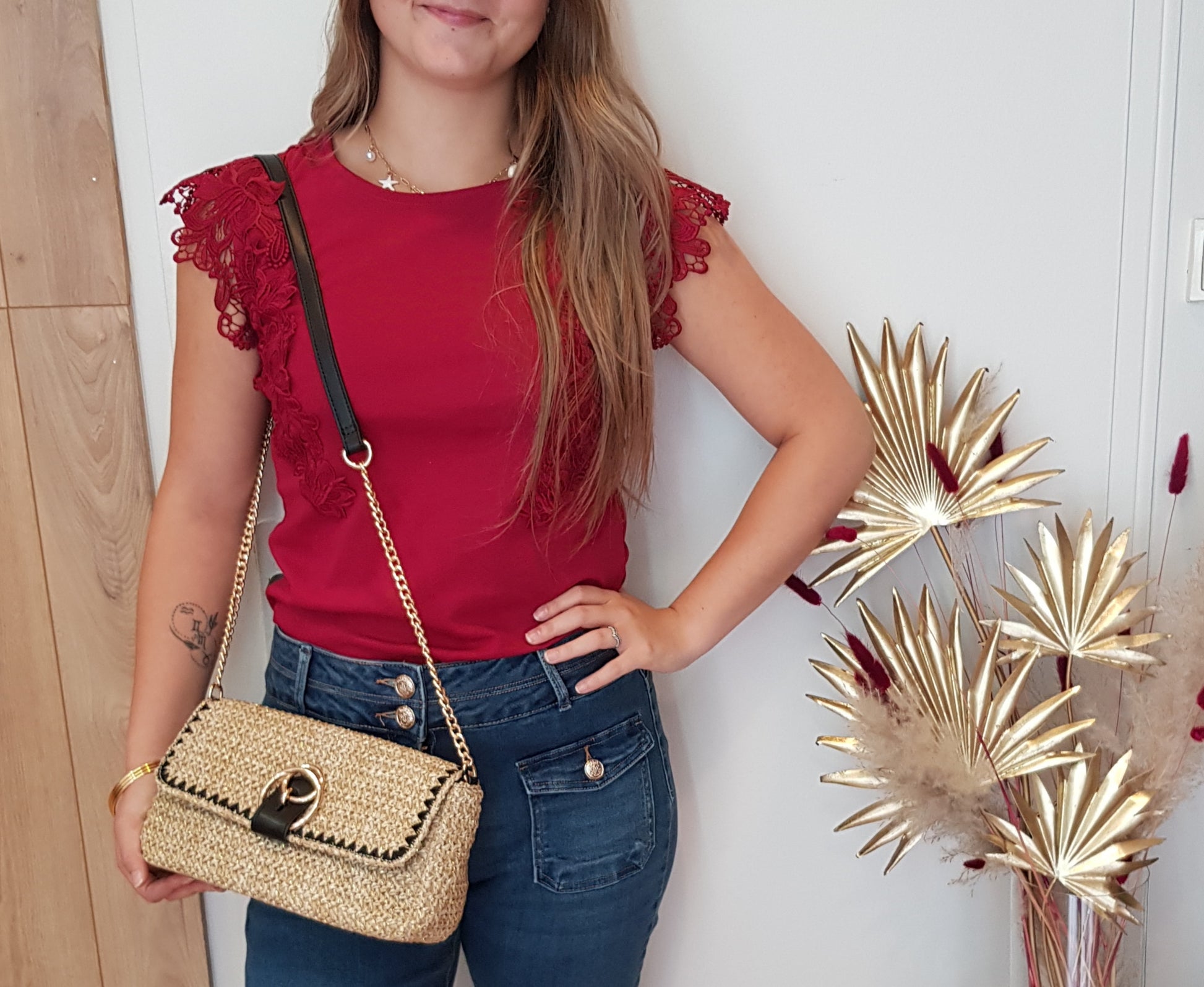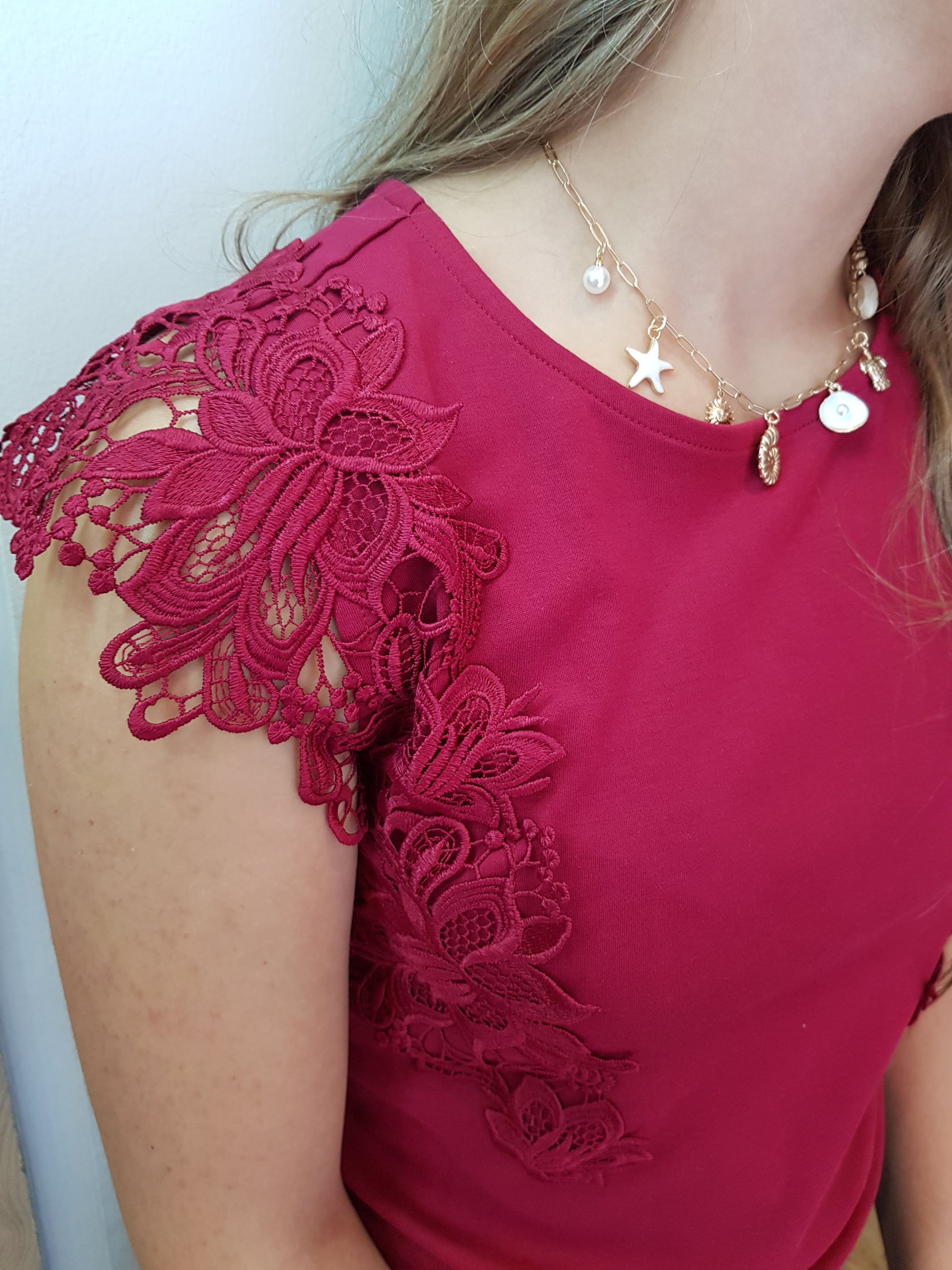 Un vrai coup de cœur pour ce T-shirt coloris raisin à épaules en dentelle, qui allie romantisme et modernité avec justesse. Sa coupe droite épouse le buste sans contrainte, tandis que les empiècements en dentelle florale sur les épaules apportent une note féminine et délicate. À porter avec un jean taille haute ou une jupe fluide pour un look de journée élégant et affirmé.