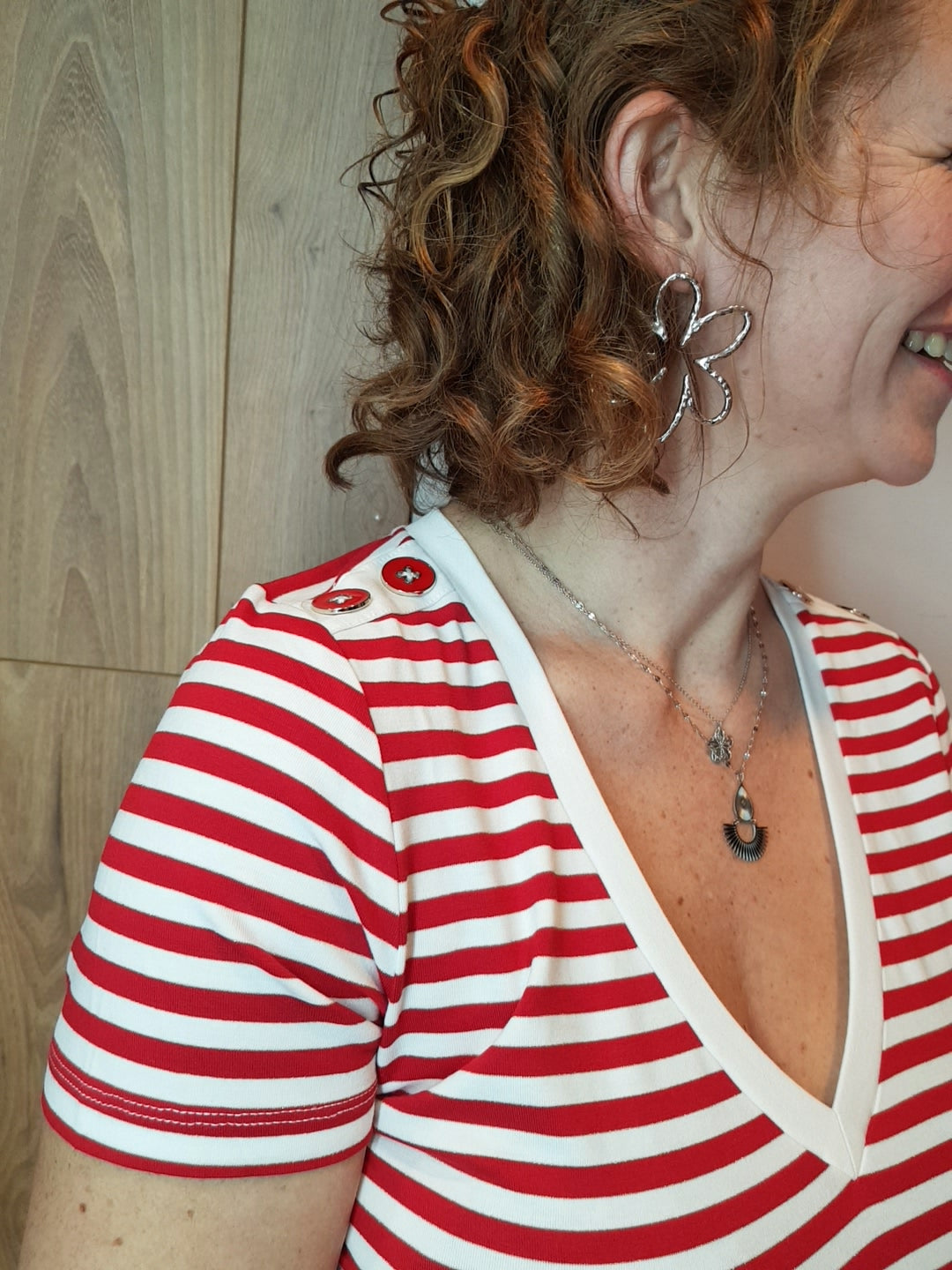 Ce t-shirt arbore une couleur rouge vibrante qui attire tous les regards, combinée à des rayures intemporelles pour une touche maritime chic. Les boutons fantaisie situés sur les épaules ajoutent une délicate pointe d’originalité et un aspect raffiné, parfait pour celles et ceux qui recherchent un style sophistiqué sans effort.